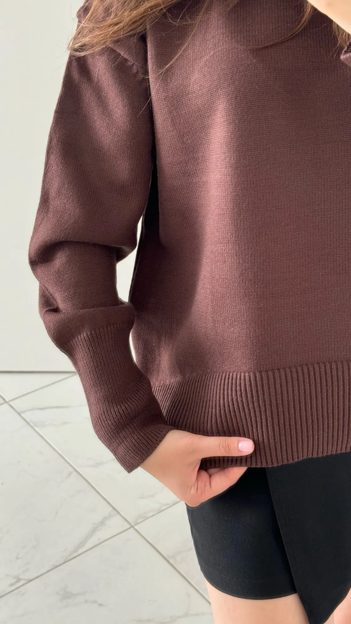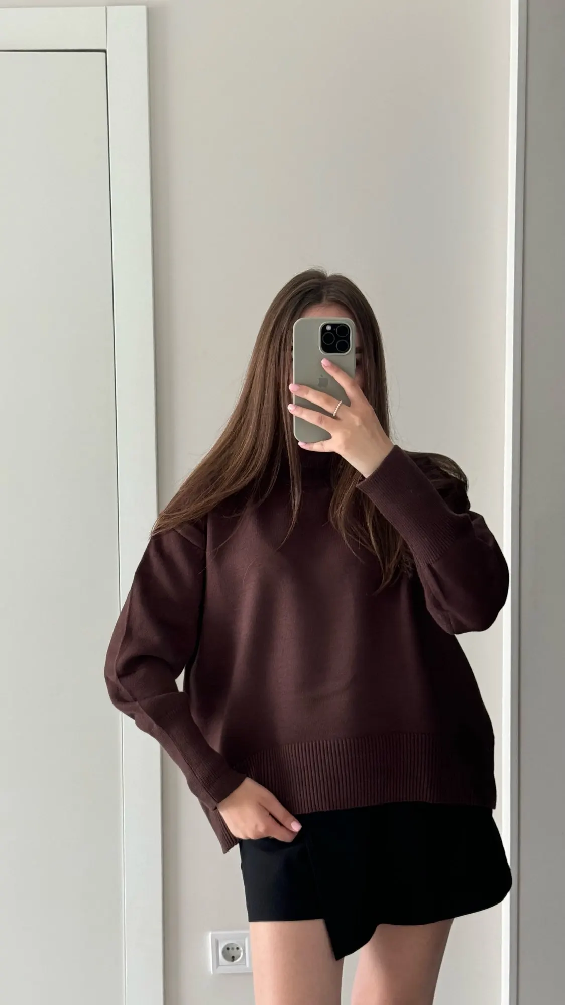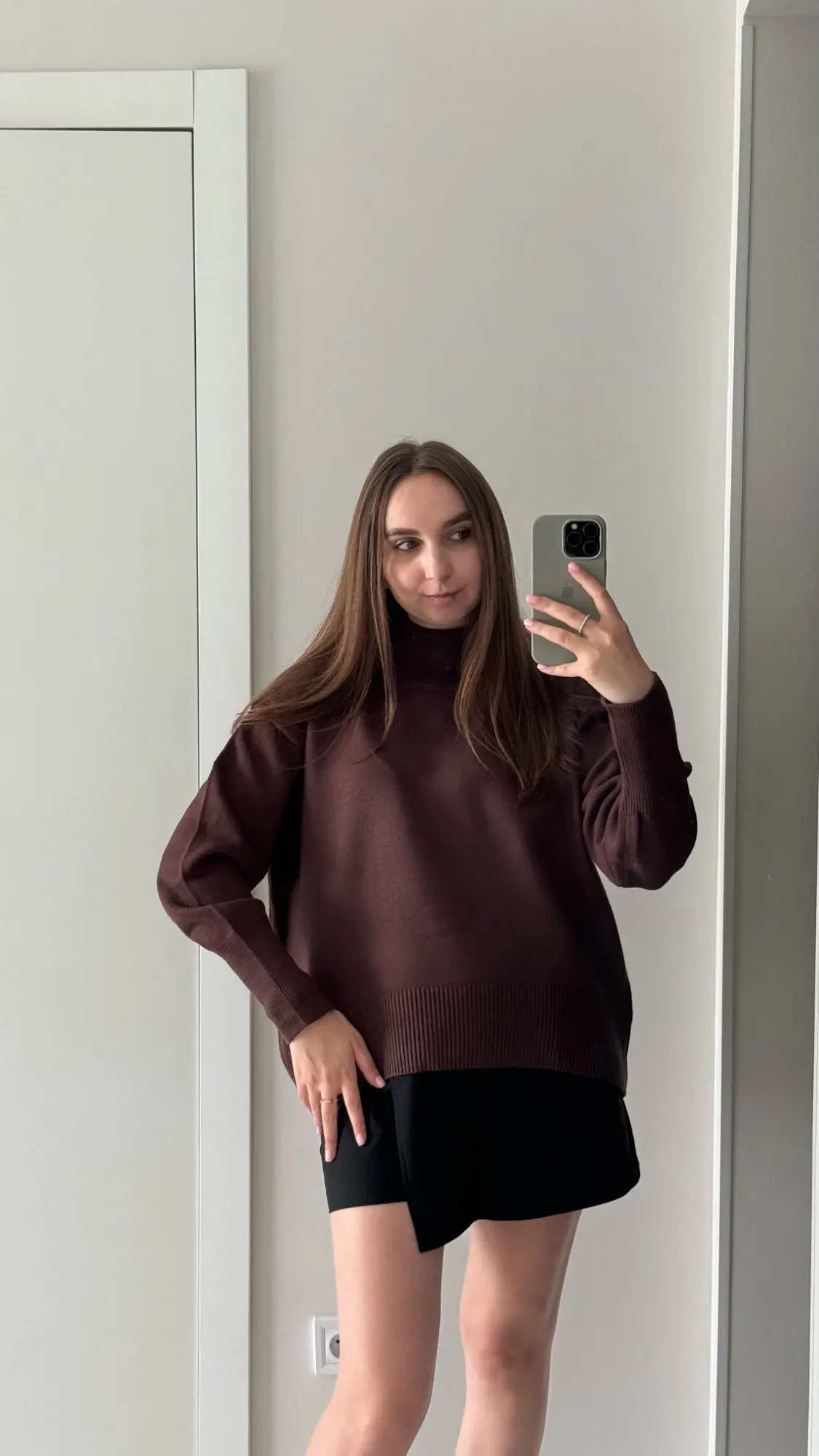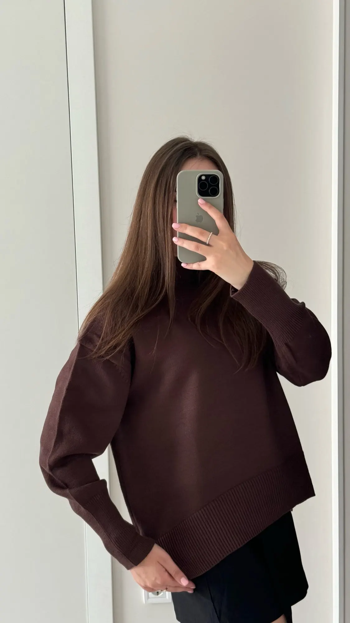 J'ai vraiment aimé le pull ! La couleur est un chocolat riche, il a l'air élégant et luxueux. Le matériau est agréable au toucher et garde bien sa forme. Mes mesures sont 78-64-94 cm, hauteur 165 cm. Le pull tombe de manière ample, exactement comme je le voulais. La longueur est idéale pour les pantalons et les jupes. Livraison à Kiev en 2 semaines. Je le recommande !